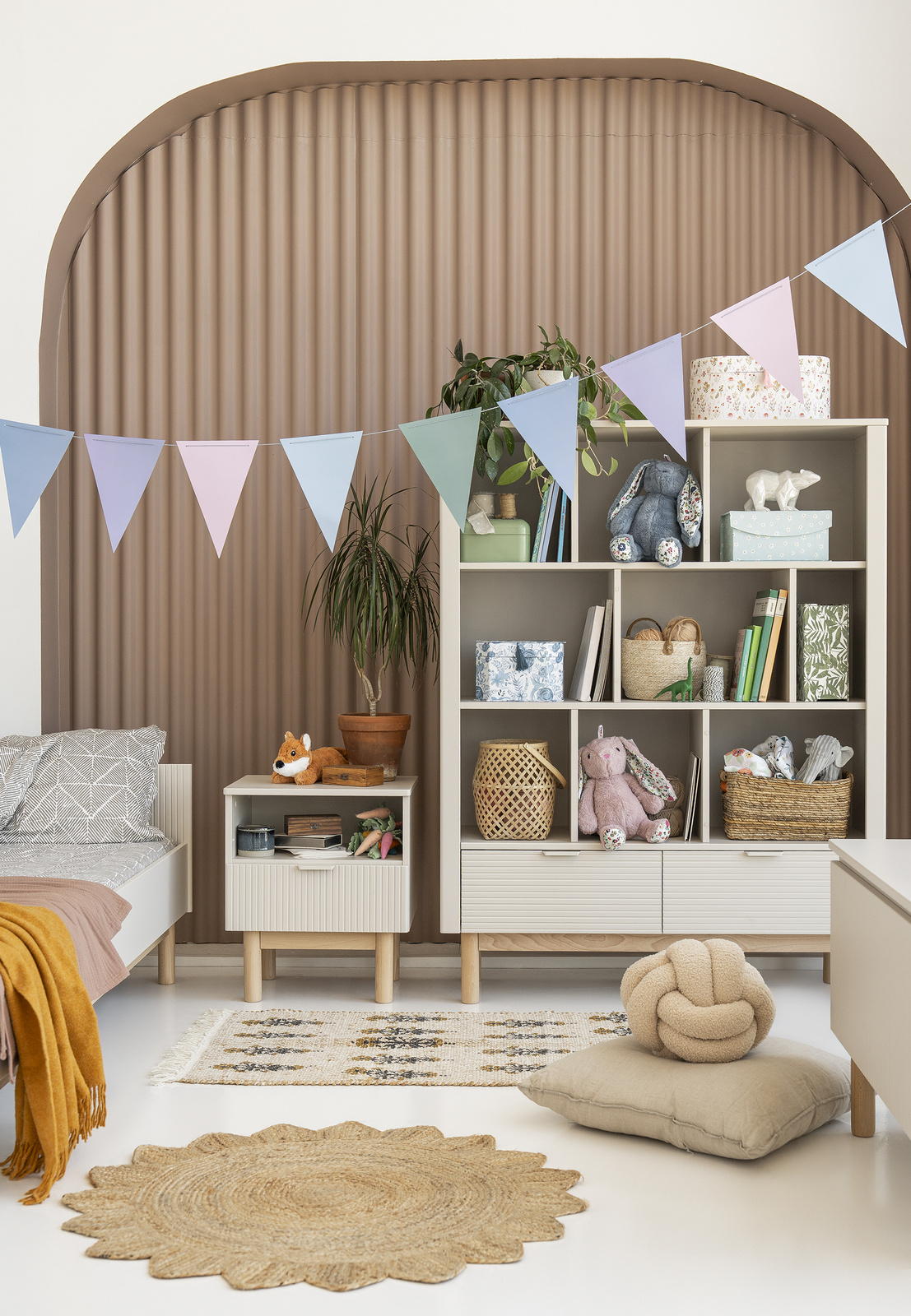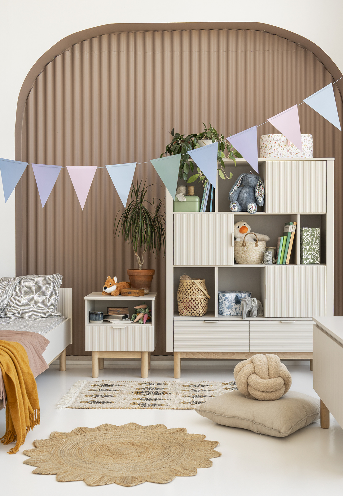 Design kolekcji kładzie nacisk na detal i elegancję – ryflowane fronty dodają charakteru i klasy, zaś delikatnie zaokrąglone narożniki gwarantują bezpieczeństwo młodych użytkowników. Estetyczne metalowe uchwyty oraz drewniane bukowe nóżki nadają meblowi lekkości i finezji.