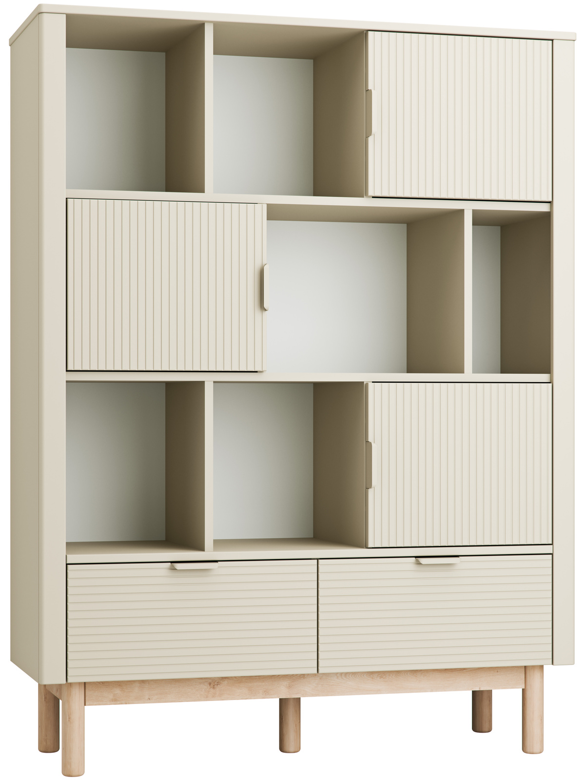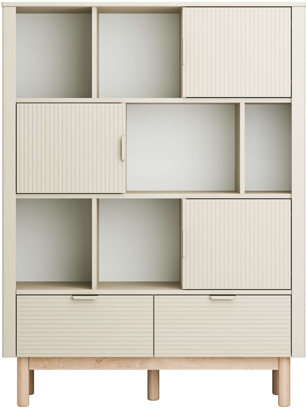 Regał szeroki z kolekcji Miloo posiada asymetryczny układ półek o różnej szerokości oraz dwie szuflady wyposażone w wysokiej jakości prowadnice z hamulcem i samodotykiem. Dodatkowo można dokupić drzwiczki (komplet 3 szt.), dzięki którym zamkniemy cześć regału.