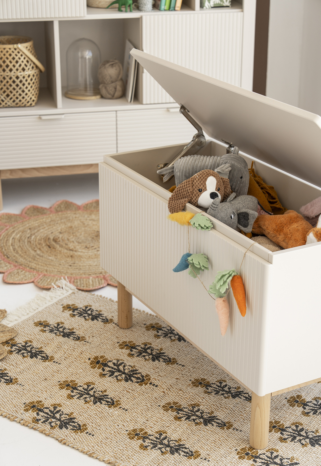 Skrzynia na zabawki wyposażona w wysokiej jakości siłownik spowalniający opadanie wieka.