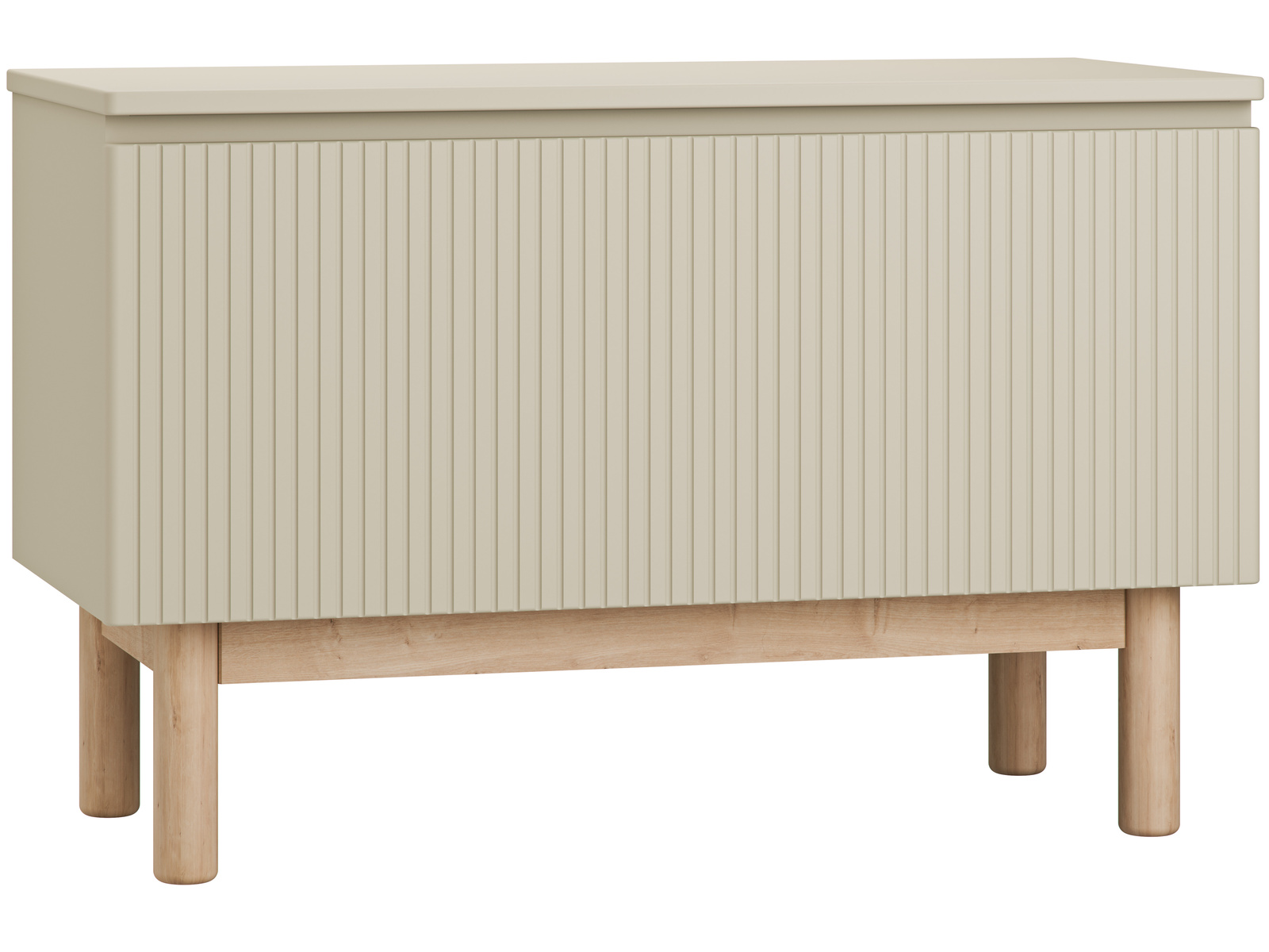 Design kolekcji kładzie nacisk na detal i elegancję – ryflowane fronty dodają charakteru i klasy, zaś delikatnie zaokrąglone narożniki gwarantują bezpieczeństwo młodych użytkowników. Estetyczne metalowe uchwyty oraz drewniane bukowe nóżki nadają meblowi lekkości i finezji. Kolekcja jest dostępna w dwóch kolorach: klasycznym białym oraz szampańskim – świeżym dodatkiem do oferty Pinio, który zdobywa szerokie uznanie wśród klientów.