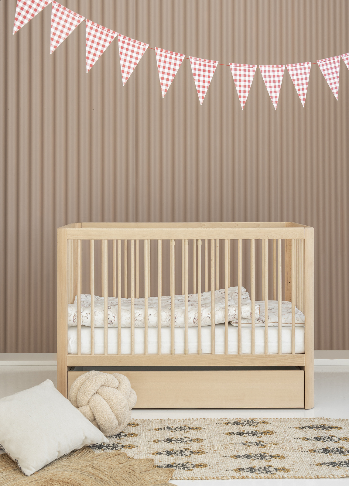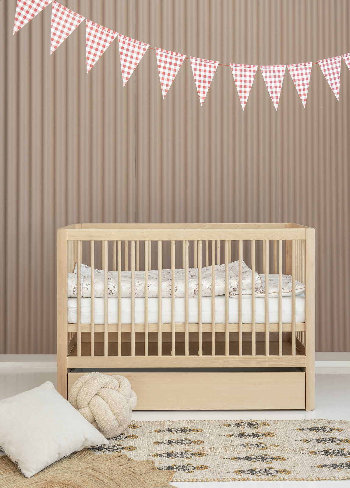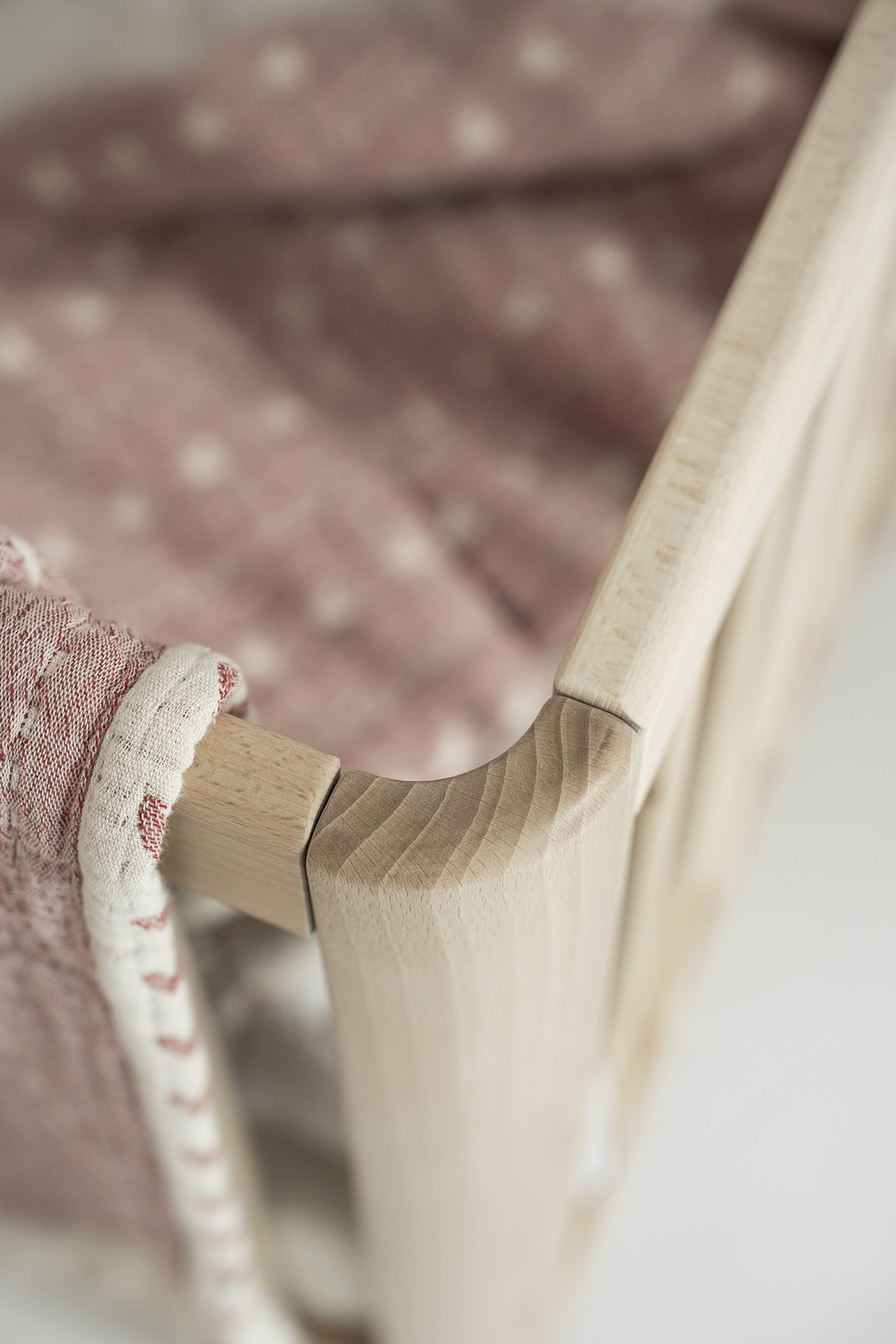 Materiały: Materiał -lite drewno bukowe, leżysko - lite drewno sosnowe. Łóżeczko zgodne z normą EN-716.