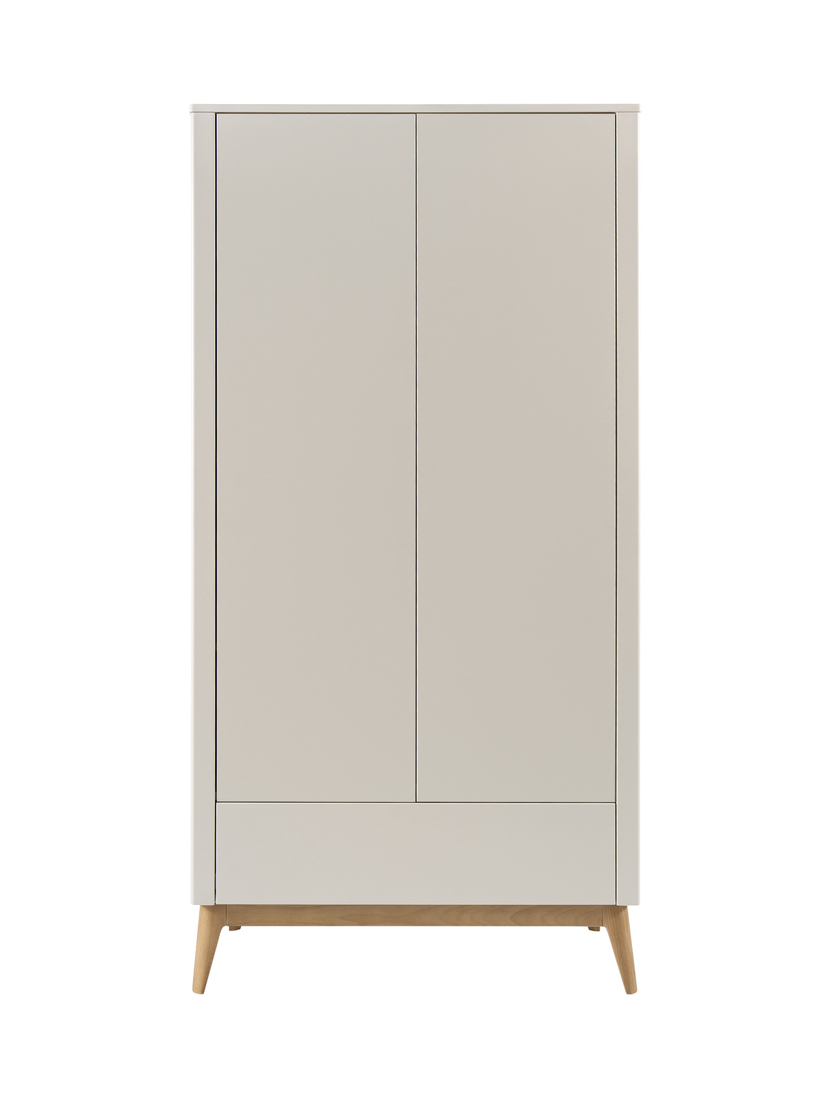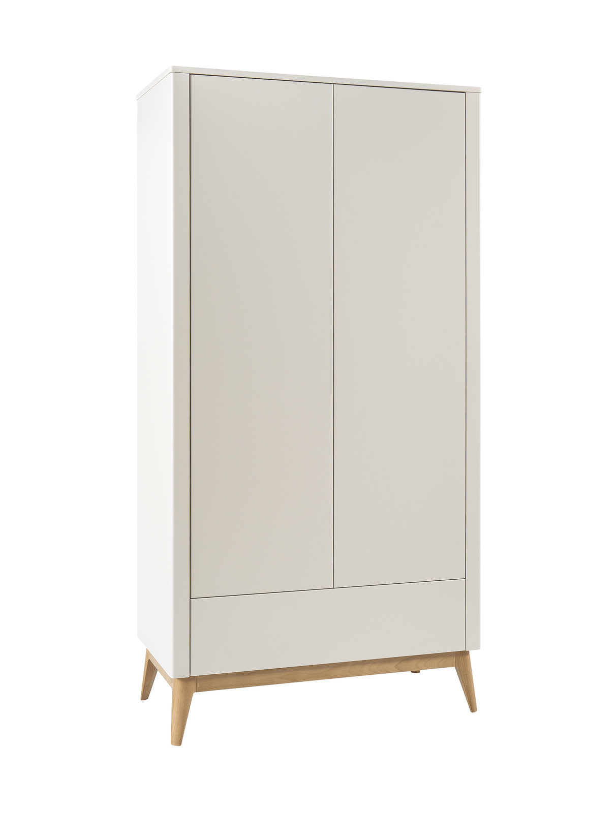 Proste, gładkie fronty i subtelnie zaokrąglone narożniki podkreślają minimalistyczny charakter mebla, zaś smukłe, bukowe nóżki dodają mu lekkości.