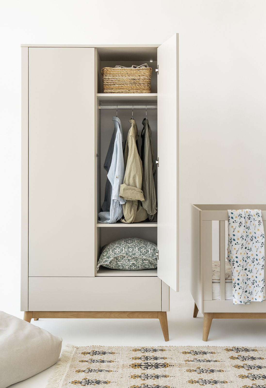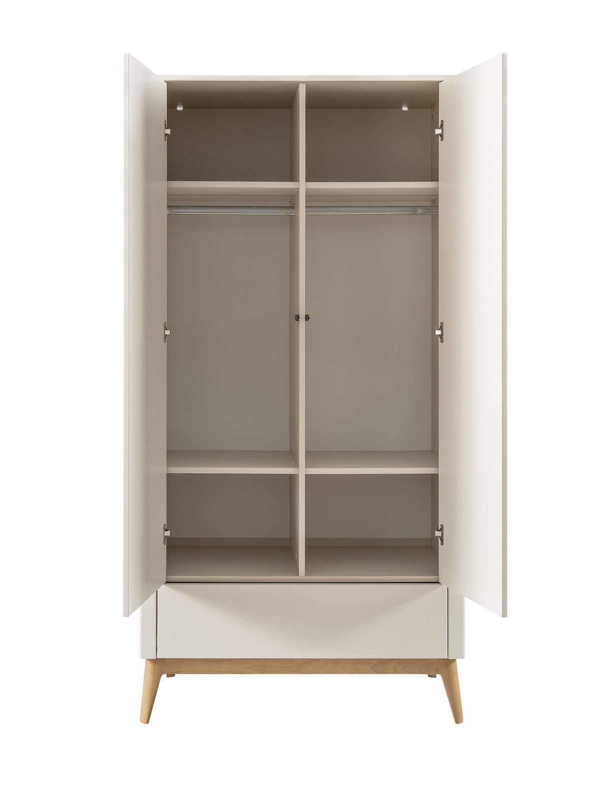 Elegancka szafa dwudrzwiowa z kolekcji Seth łączy w sobie funkcjonalność i wysmakowaną formę, z dwoma drzwiami oraz szufladą w systemie push-to-open. Wnętrze zostało podzielone pionową przegrodą, oferując cztery regulowane półki oraz dwa drążki na ubrania; opcjonalnie można dokupić dwie dodatkowe półki, by jeszcze lepiej dopasować układ do swoich potrzeb.
