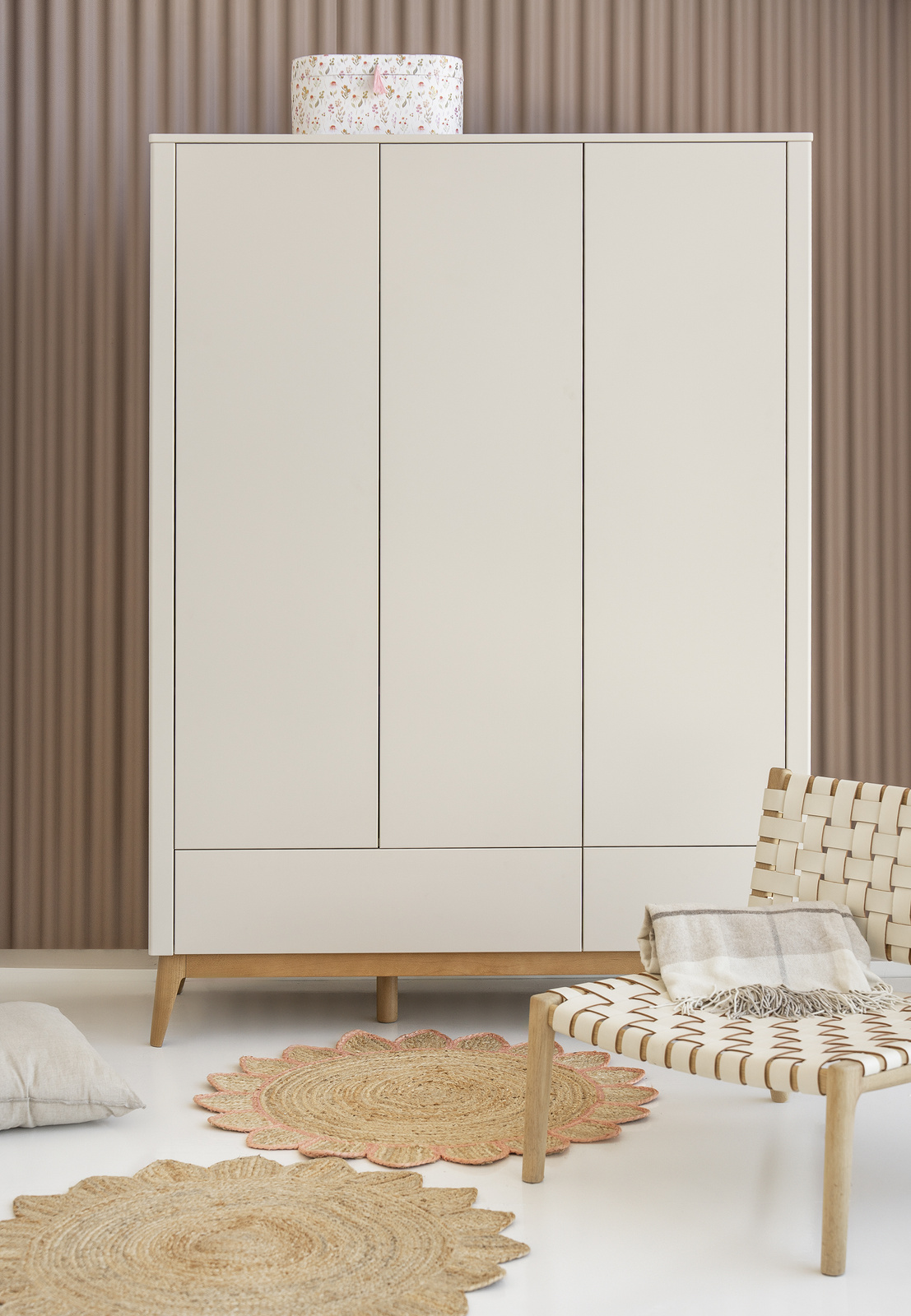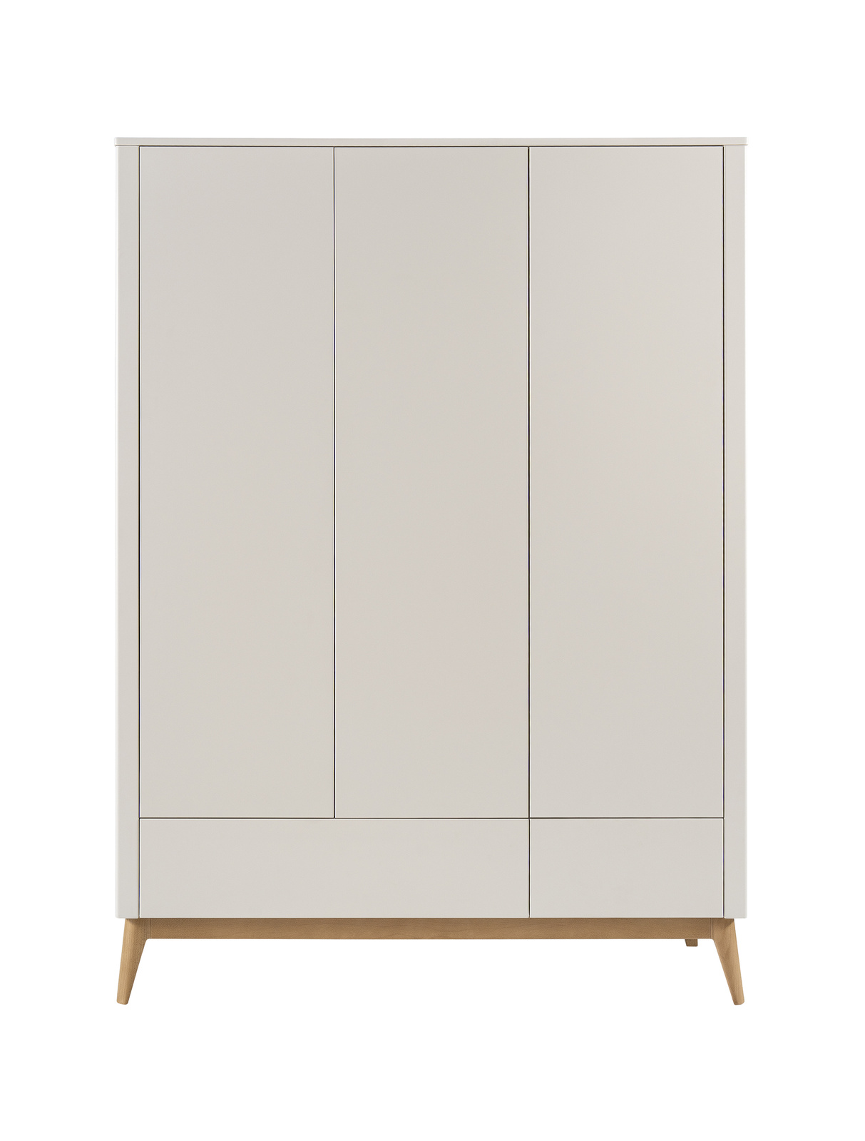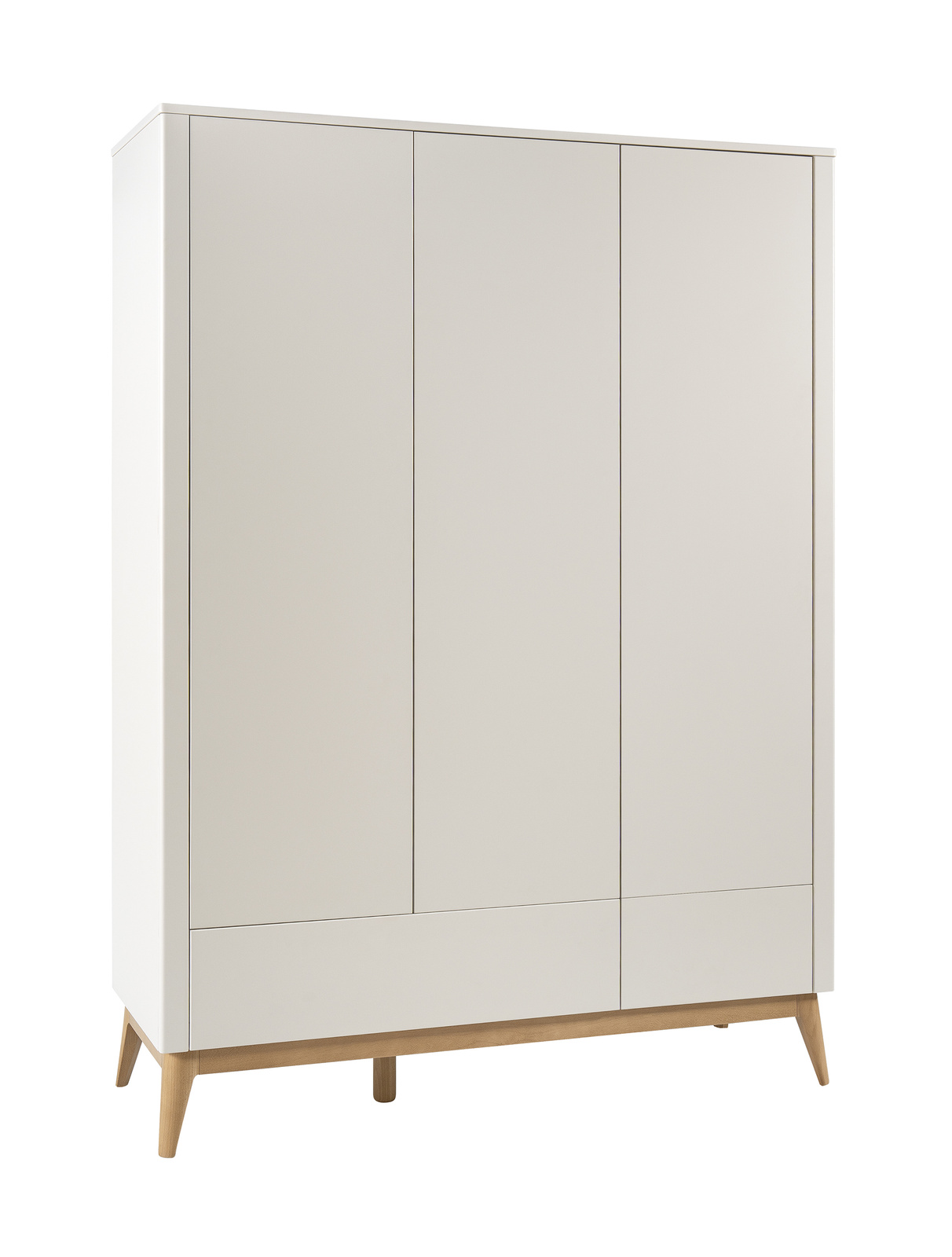 Elegancka szafa trzydrzwiowa z kolekcji Seth łączy w sobie funkcjonalność i wysmakowaną formę, z trojgiem drzwi oraz dwoma szufladami w systemie push-to-open. Wnętrze zostało podzielone dwoma pionowymi przegrodami, oferując siedem regulowanych półek oraz dwa drążki na ubrania; opcjonalnie można dokupić dwie dodatkowe półki (do zewnętrznych części szafy), by jeszcze lepiej dopasować układ do swoich potrzeb. Szuflady można zamontować w dwóch wariantach (węższa szuflada może być zarówno z lewej, jak i z prawej strony).